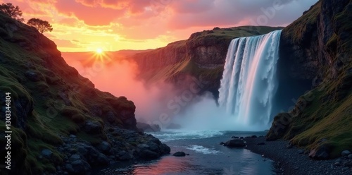 Majestic waterfall at sunset, rocky gorge, moody light, dark, adventure, dramatic