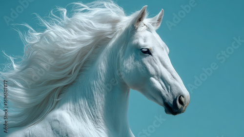 Majestic White Stallion with Flowing Mane on Sky Blue Background