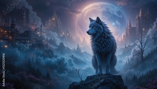 Majestic White Wolf Guards a Mystical Castle Town at Night