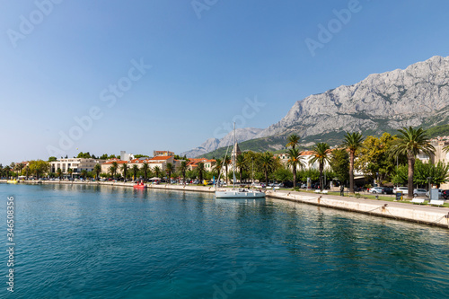 Makarska in Dalmatia, Croatia. View from the sea on a sunny day and a blue sky in the summer. A famous place with beaches and palm trees. Holiday destination at the beautiful Mediterranean coast