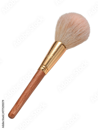 Makeup powder brush with champagne-gold ferrule, rose wooden handle, and soft beige bristles slightly fanned, fine fiber texture, isolated on transparent background