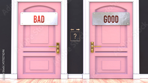 Making a choice and deciding in favor of either Bad or Good. Two different paths to go through and two outcomes. Facing a question that requires a serious decision to be made.,3d illustration