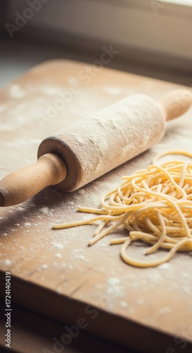 Making fresh pasta with a rolling pin on a wooden cutting board in a cozy kitchen setting