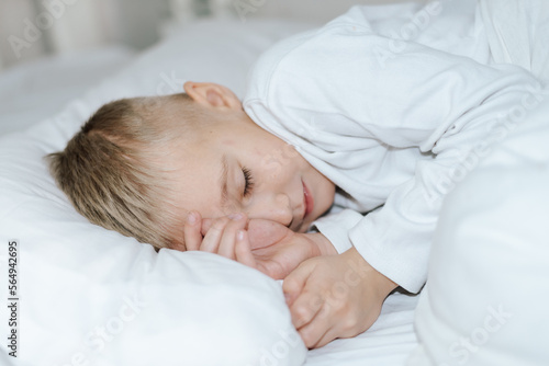Мальчик спит в кровати . белая постель