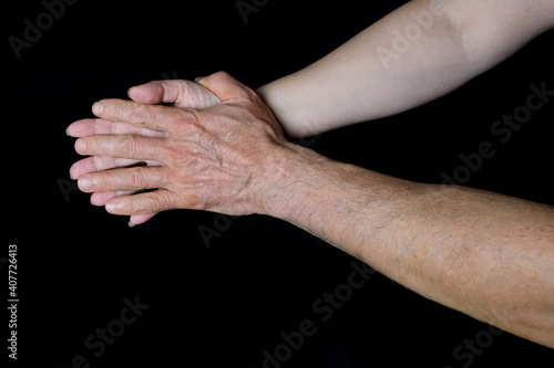 male and female hands together on black background, old skin with wrinkles and veins, concept of health, age-related changes, love, tender relationship of a couple in love, isolated image