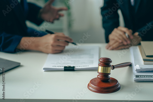 Male attorneys or judges consult teams with clients, business and legal services. The consultant presents the contract signed with the hammer placed in front and concept of justice and lawyer