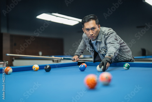 male billiard player aiming the ball seriously using the cue stick while playing billiard at the billiard studio