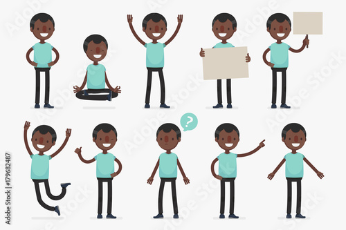 Male character in casual clothes in different poses: Vector illustration.