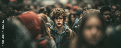 Male college student standing alone among a crowd of other students, concept of the feeling of isolation and loneliness due to mental illness