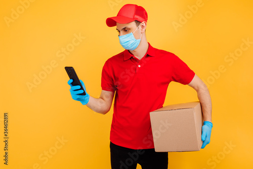 male courier in a red uniform, medical mask and gloves holds a cardboard box and uses a mobile phone on a yellow background. Delivery service, online stores