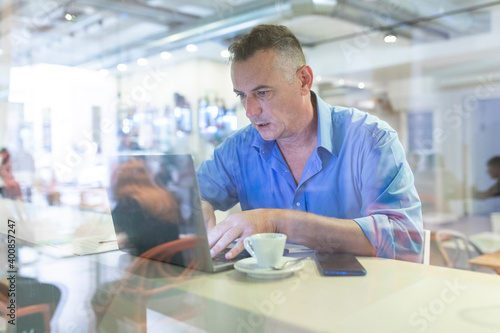 Male entrepreneur using laptop while sitting with coffee in cafe