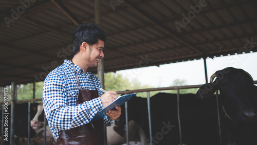 male farmer checking on his livestock and quality of milk in the dairy farm .Agriculture industry, farming and animal husbandry concept ,Cow on dairy farm eating hay,Cowshed.