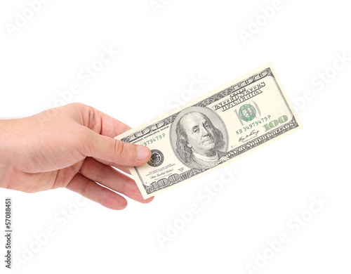 Male hand holding 100 Dollar bill.