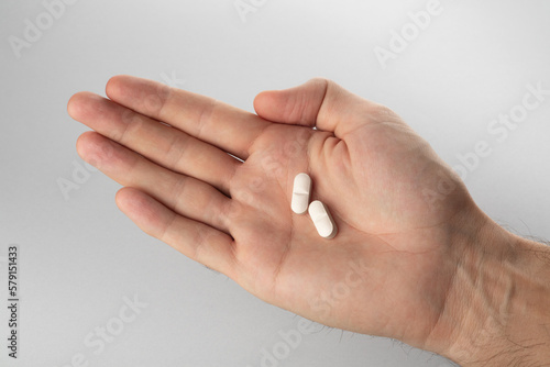 Male hand holding two pills in hand on grey background, taking Your medication. Close up