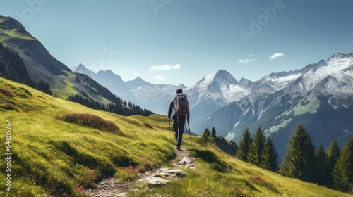 Male hiker, full body, view from behind, walking on a trail in the alps