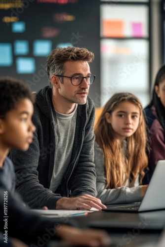 Male instructor with laptop, engaged students on computers