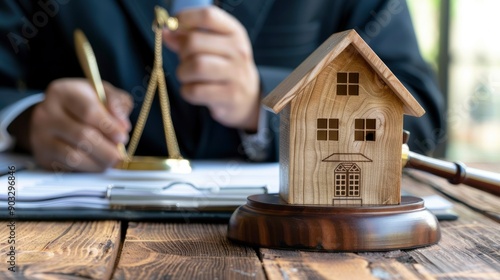 Male judge sitting at desk with gavel and small wooden toy house, working with documents, signing contract agreements. Real estate law, divorce property, house foreclosure and bankruptcy concept, ai