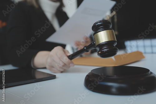 Male lawyer working with contract papers and wooden gavel on tabel in courtroom. justice and law ,attorney, court judge, concept.