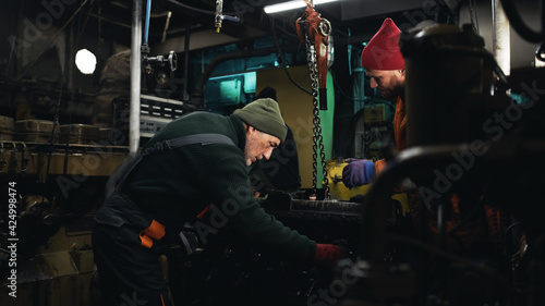 Male mechanics assembling engine on ship