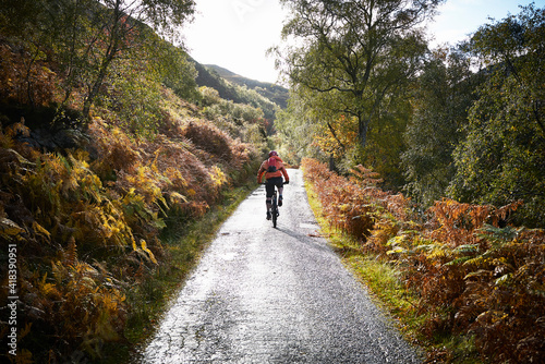 Male mountain biker biking on rural road, rear view, Achnasheen, Scottish Highlands, Scotland
