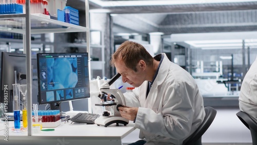 Male science expert operates with microscope and laboratory tray, studying chemical and biological samples for medical research. Magnified observation of DNA in modern science.