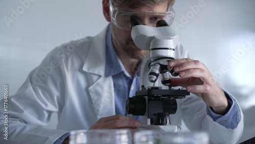Male scientist wearing lab coat and protective glasses using microscope doing research in modern laboratory setup, portrait view. Low key lighting photo. Science and Medicine concept