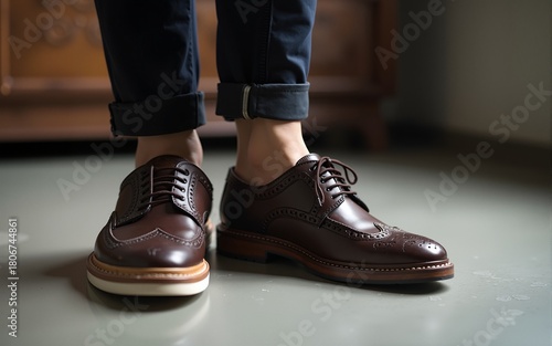 Male work and pleasure - one foot in a sneaker and the other in an elegant dress shoe. High quality