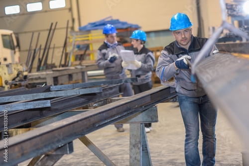 Male worker positioning a metal bar in metal factory