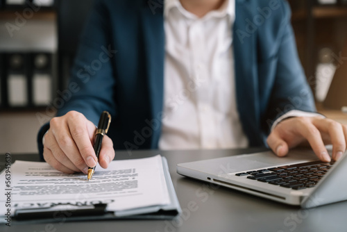 Male writes information businessman working on laptop computer writing business plan while sitting in office.