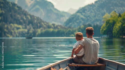 Man and child enjoying tranquil boat ride on scenic lake surrounded by mountains