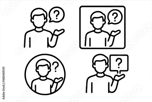Man asking question icon set. Person with question mark speech bubble. Line art for FAQ, help, support, query, problem, solution, doubt, assistance, info, and communication vector.