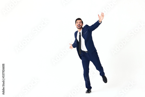 Man business smile with teeth in costume running and jumping flying up open mouth happiness and surprise full-length on white isolated background copy space