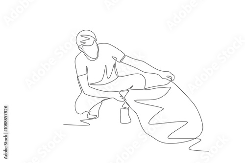 Man collects plastic waste. Plastic pollution concept one-line drawing
