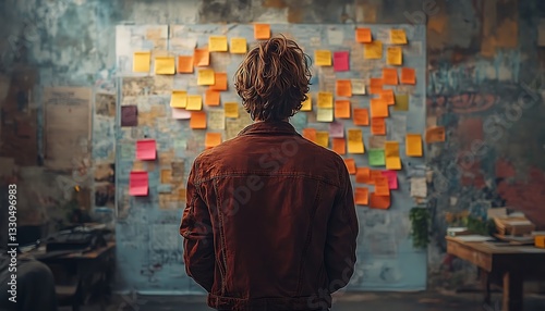 Man Contemplating Ideas On Wall With Colorful Sticky Notes