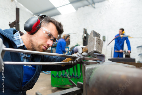 man cuts metal in a workshop