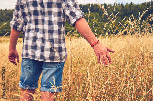 Man enjoying the meadow while touching the grass / wheat plants.