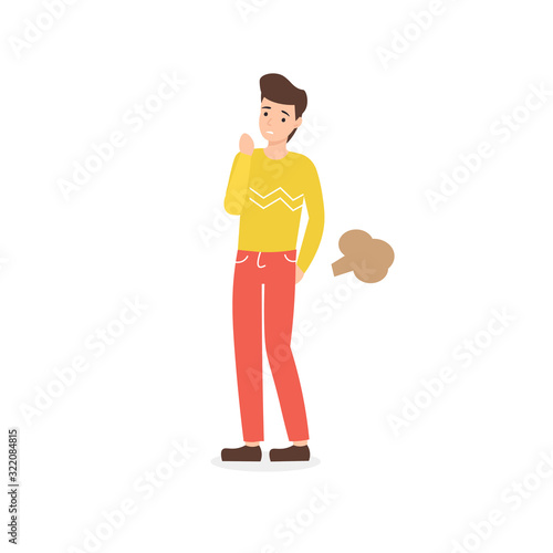Man farting. Bad smell, guy in shy. Flat vector cartoon illustration.