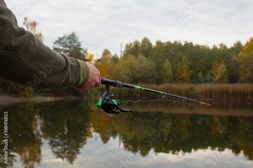 Man fisherman catches a fish on a fishing rod with a reel on the lake against the background of the forest and sky with clouds.