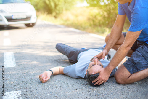 man giving first aid in car accident