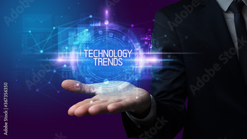 Man hand holding TECHNOLOGY TRENDS inscription, technology concept