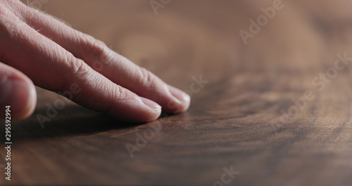 man hand touch oil finished black walnut wood surface