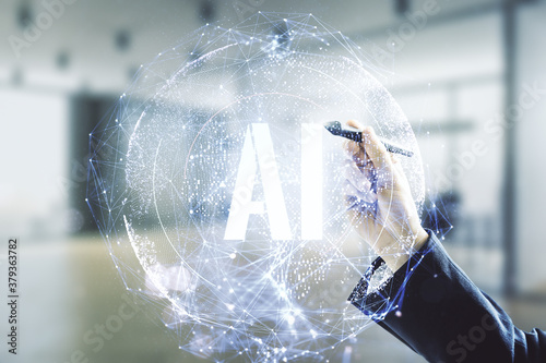 Man hand with pen working with creative artificial Intelligence symbol hologram on blurred office background. Double exposure