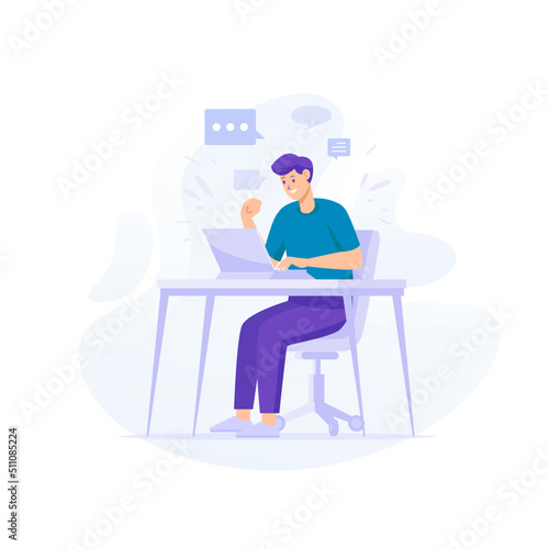Man Happy Working on the Desk with Laptop Concept Flat Illustration