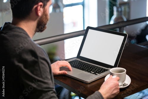 Man holding coffee cup and using laptop