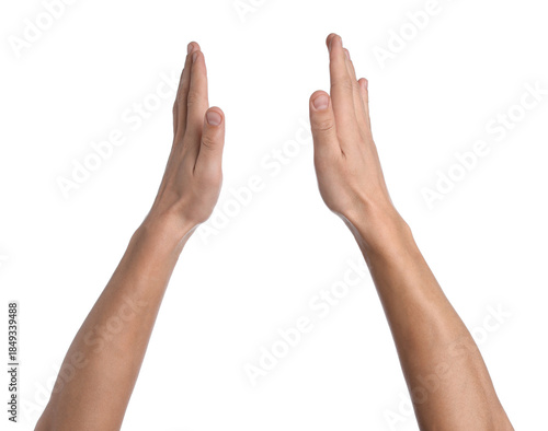 Man holding something on white background, closeup