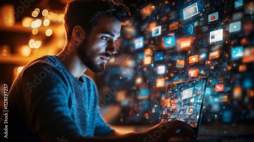 Man Immersed in Digital World of Icons and Data
