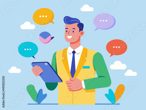 Man in a suit holding a tablet surrounded by speech bubbles and clouds on a light blue background