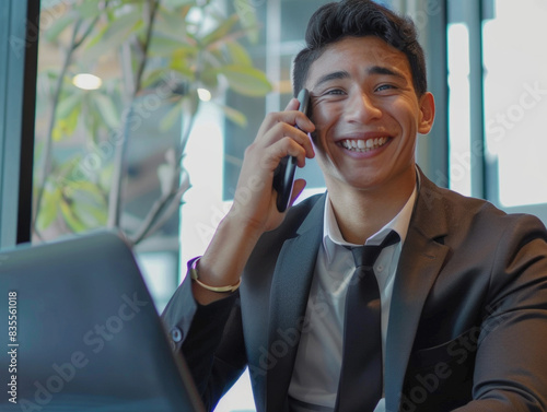 Man in a suit speaking on his cell phone, possibly in an office or public setting