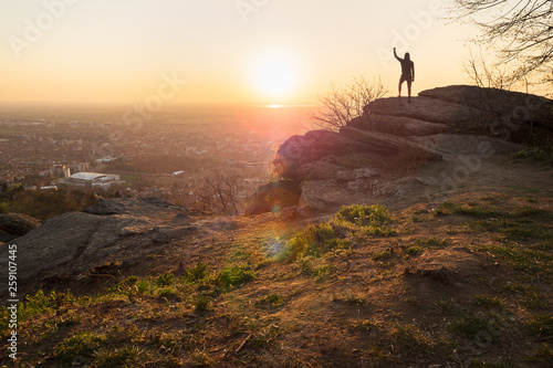 Man in black track suit standing on mountain cliff in sunset. People in nature.