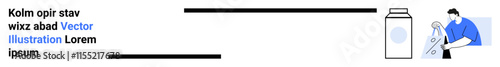 Man in blue shirt pouring liquid from clear bottle next to a milk carton, with placeholder text containing a blue Vector Illustration link. Ideal for webpage design, placeholder text, template
